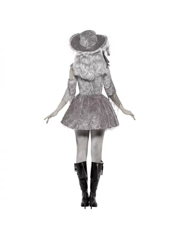 Le chapeau gris assorti comporte un large bord, des pans de tulle et de la dentelle blanche pour un look encore plus effrayant. Pour parfaire votre look de fantôme pirate femme, nous vous conseillons d’ajouter quelques accessoires comme une cache-oeil, des bottes, une perruque, du maquillage et des vernis à ongles dans des tons assortis.