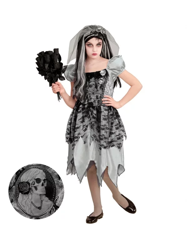 Ce costume de mariée mortifiée est décliné sous des tailles variées pour les fillettes de 5 à 13 ans. Mais attention, en lui enfilant ce déguisement, évitez de la faire regarder dans le miroir !